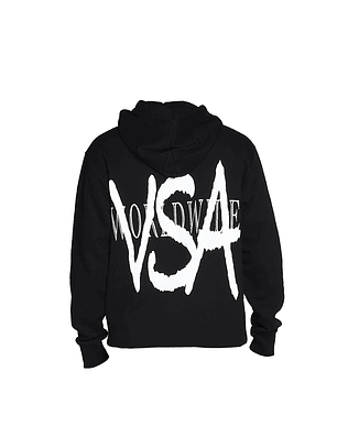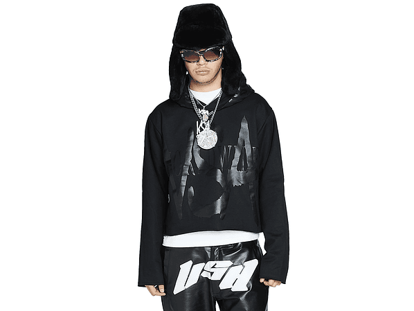 Polerón con capucha/ Estampado color negro delantero / Estampado negro en gorro / Estampado atrás color negro/ Etiqueta bordada interior / Amplia capucha